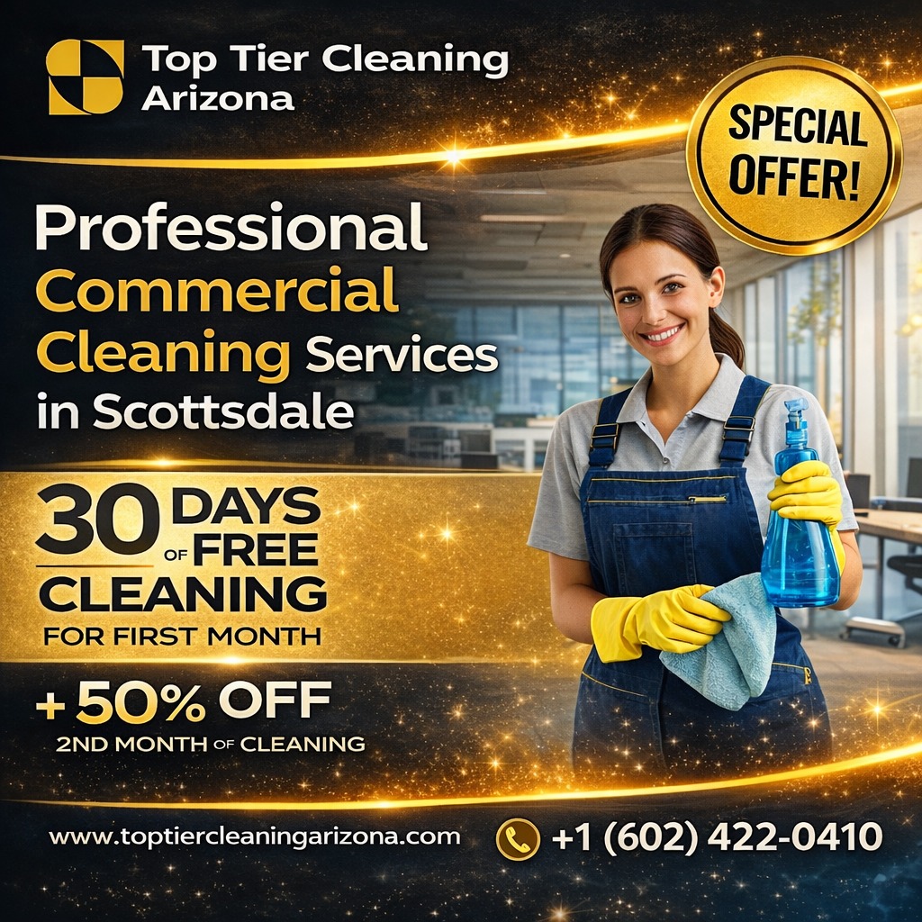 Top Tier Cleaning Arizona provides expert commercial cleaning services designed for businesses in Scottsdale and across Arizona. Our comprehensive services include everything from everyday cleaning to deep sanitization, ensuring your space is healthy, spotless, and welcoming for employees and clients.